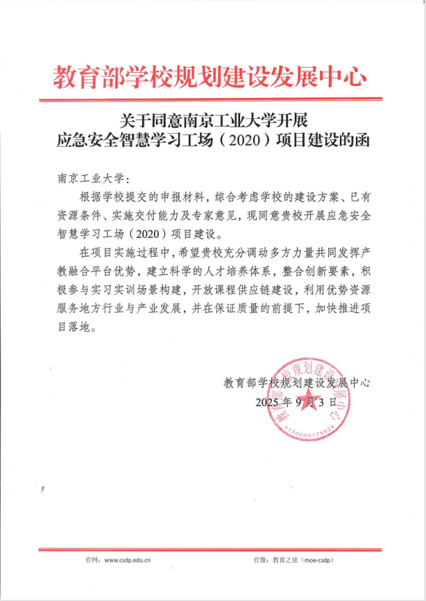 近日,教育部学校规划建设发展中心来函通知《关于同意太阳成tyc7111cc开展应急安全智慧学习工场(2020)项目建设的函》,同意我校开展应急安全智慧学习工场项目建设。